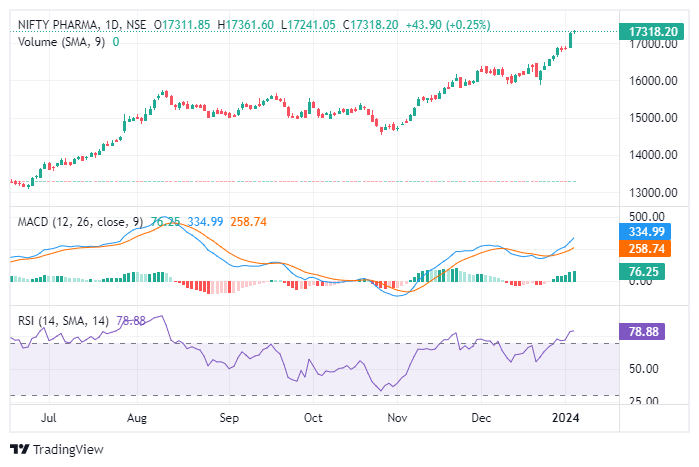 Today's top gainers in the stock market include Divi’s Lab, closing at 4037 with a 3.09% increase, Adani Port concluding at 1079 with a 2.97% rise, and Sun Pharma finishing at 1295.15 with a 2.77% gain. The Nifty Pharma sector exhibited positive momentum today, recording a 2.46% increase and reaching 17,274.30 points.